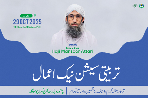 تربیتی سیشن نیک اعمال اس سیشن میں پاکستان بھر کے جامعات المدینہ کے طلباء کرام اور اساتذہ کرام اورجامعۃ المدینہ کا اسٹاف شرکت فرمائیں گے...